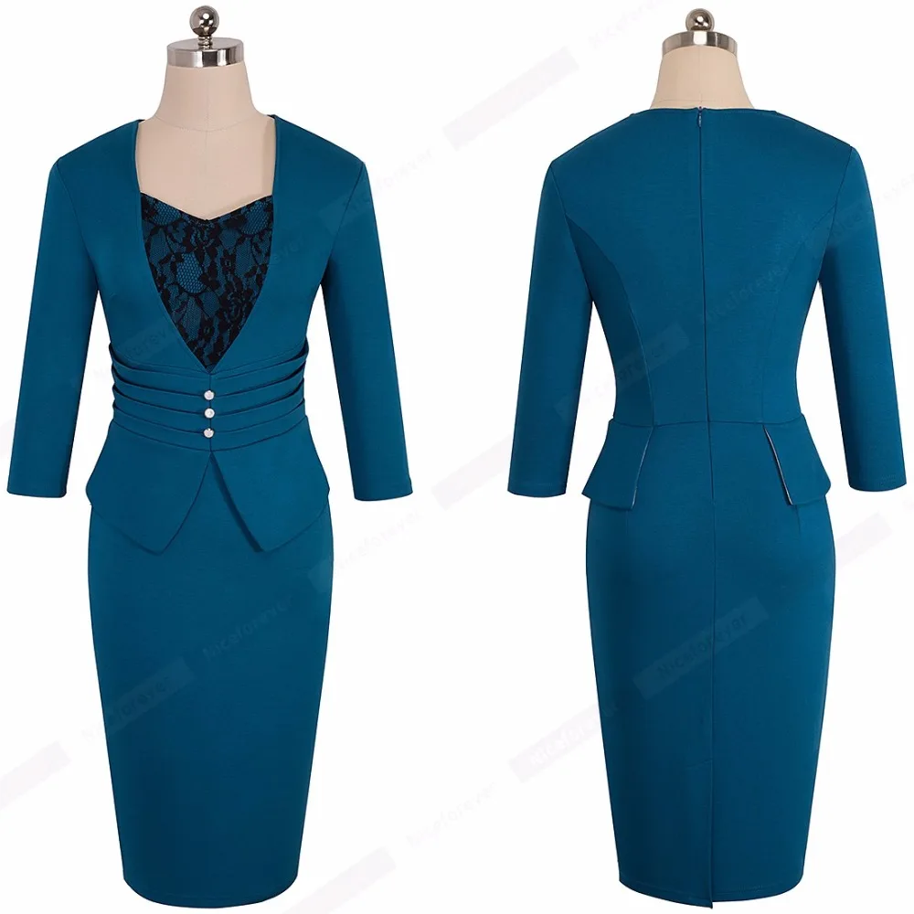 BEST One-piece Formal Wearing V Neck Lace Drape Pearl-white Button Pencil Office Dress Women Knee Length