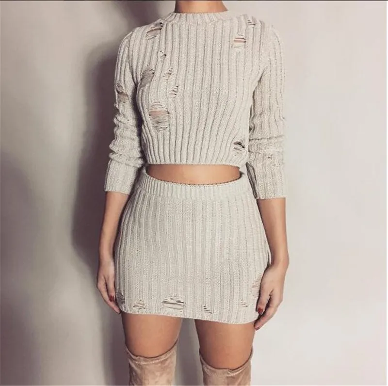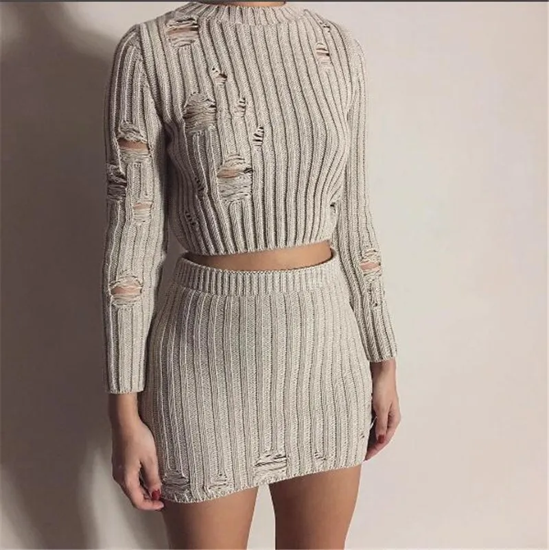Women Autumn Knitted Dress Sexy 2 Piece Set Fashion Hollow Out Holes Bodycon Mini Dress Sexy Crop T