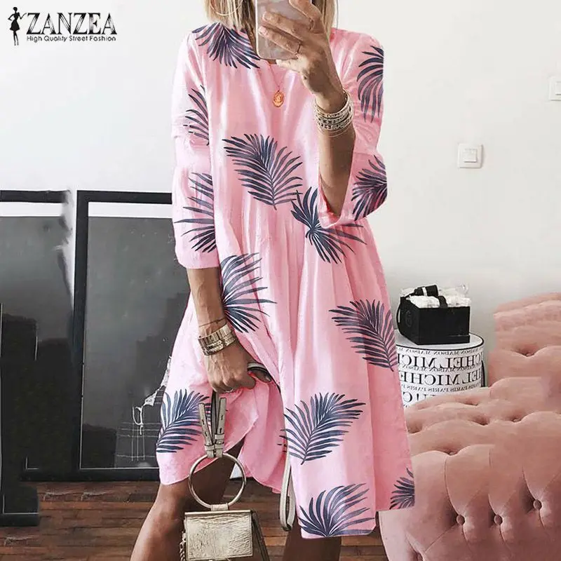 BEST QUALITY ZANZEA Plus Size 2020 Women Dress Autumn Summer Short Vestido Holiday 3/4 Sleeve Printed Beach Ladi