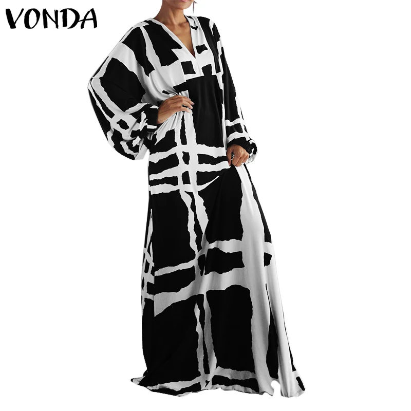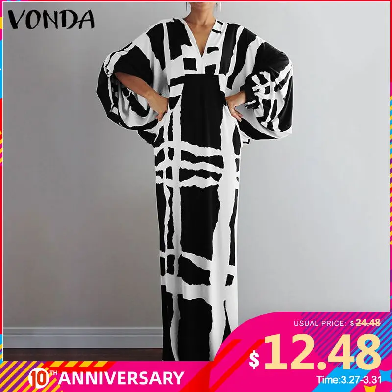 VONDA Vintage Long Maxi Dress 2020 Autumn Sexy V Neck Long Sleeve Printed Dresses Femme Loose Sundr